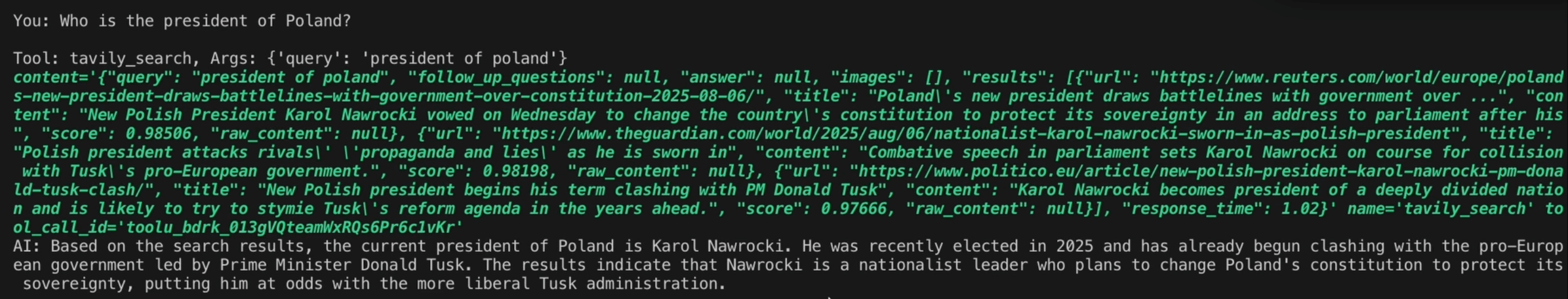 Now that you understand Tavily’s capabilities, let’s build an intelligent agent that knows when and how to use web search.