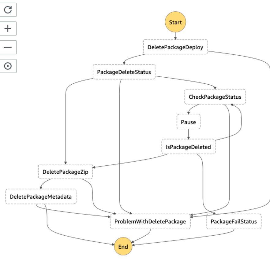 After the deployment,we got the diagram shown below. As you can see, the loop has been used in order to wait for the result returned from the CloudFormation stack. Basically, it allows you to get rid of sync calls and react, depending on the returned status from another service.