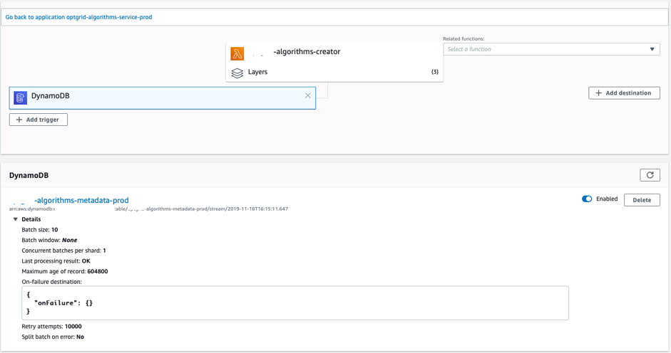 events:- stream:type: dynamodbarn:Fn::GetAtt: [AlgorithmsMetadataTable, StreamArn]- stream:type: dynamodbarn:Fn::GetAtt:- AlgorithmsMetadataTable- StreamArnbatchWindow: 3maximumRetryAttempts: 10startingPosition: LATESTenabled: True