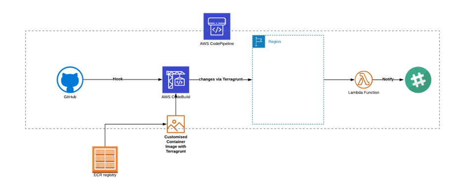 Then, with a simple terraform.tfvars, you can set variables used in particular terraform modules located in source="../../../modules/", and with a specified module/product you want to use. Our example depicts a CI/CD pipeline for terraform infrastructural changes built on top the CodePipeline + CodeBuild + Lambda Notification (terragrunt-deployments).