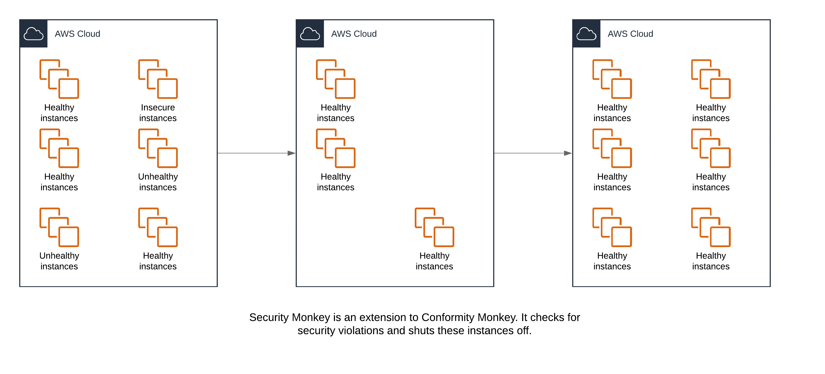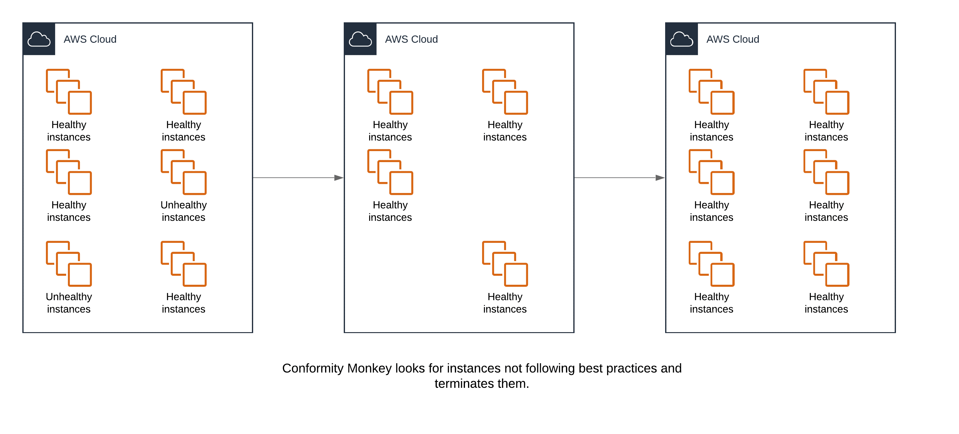 - Conformity Monkey looks for instances not following best practices and terminates them.