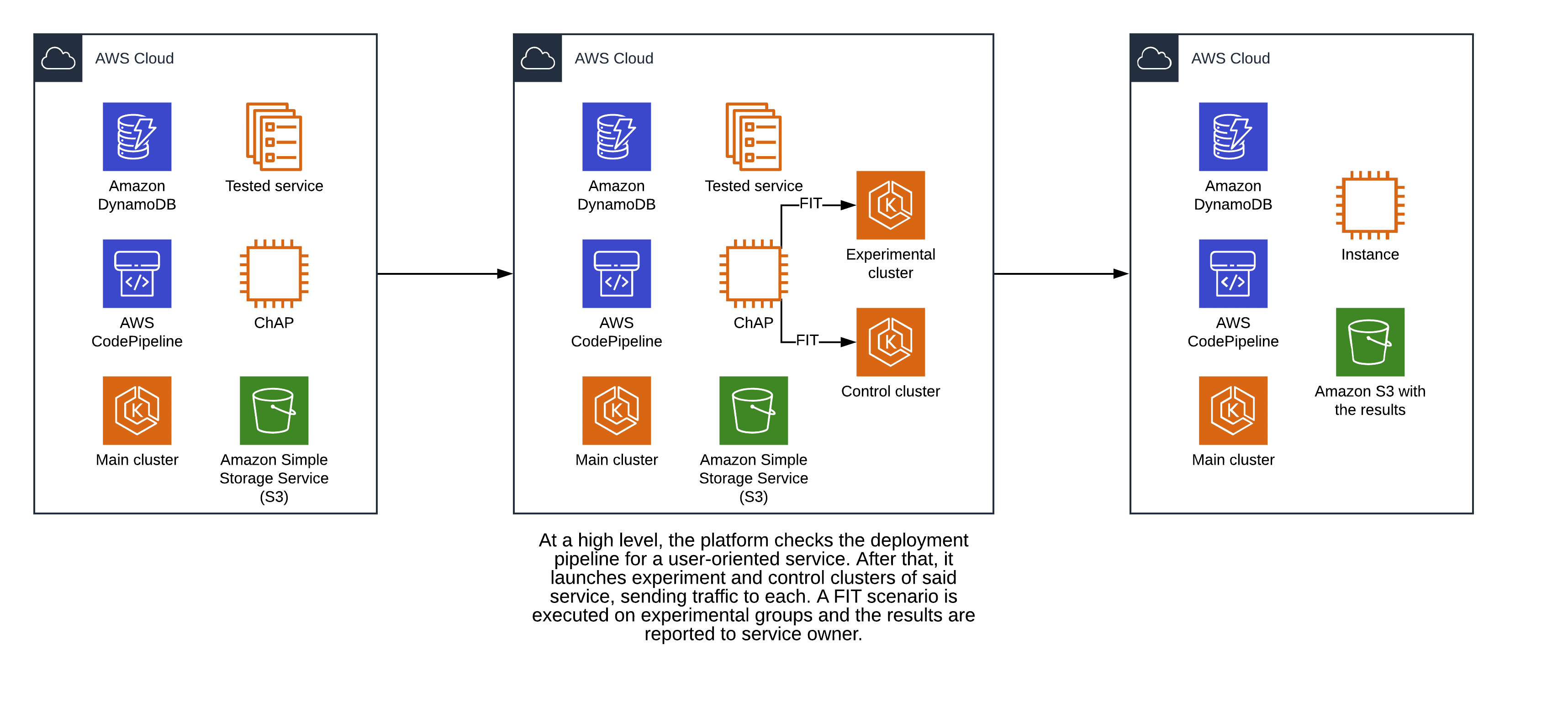 At a high level, the platform checks the deployment pipeline for a user - oriented service. After that, it launches experiment and control clusters of said service, sending traffic to each. A FIT scenario is executed on experimental groups and the results are reported to service owner.