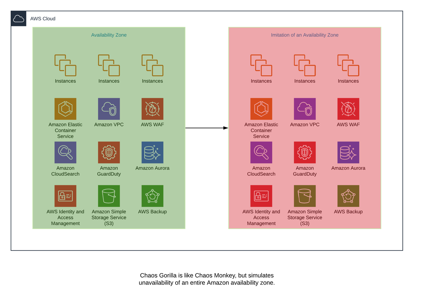 - Chaos Gorilla is like Chaos Monkey, but simulates unavailability of an entire Amazon availability zone.