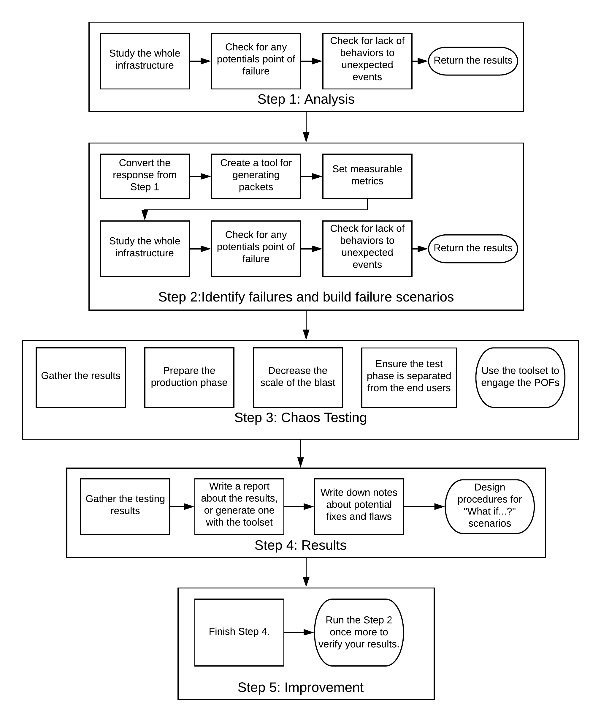 - Identify failures and build failure scenarios Convert response from Step 1 into more complicated scenarios. In this example, create a tool for generating packets and set measurable metrics to check service behavior.