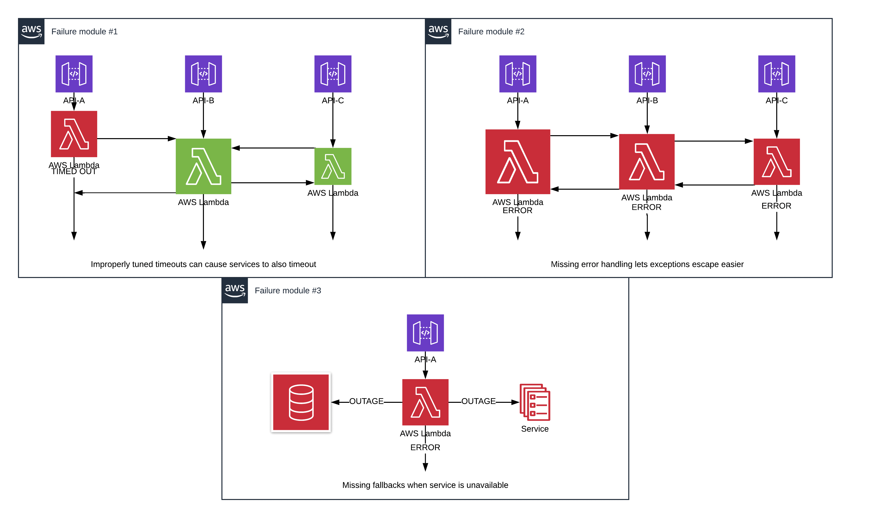 - Intermediary services (e.g. Kinesis, SNS, API Gateway, etc.) have their own failure modes;