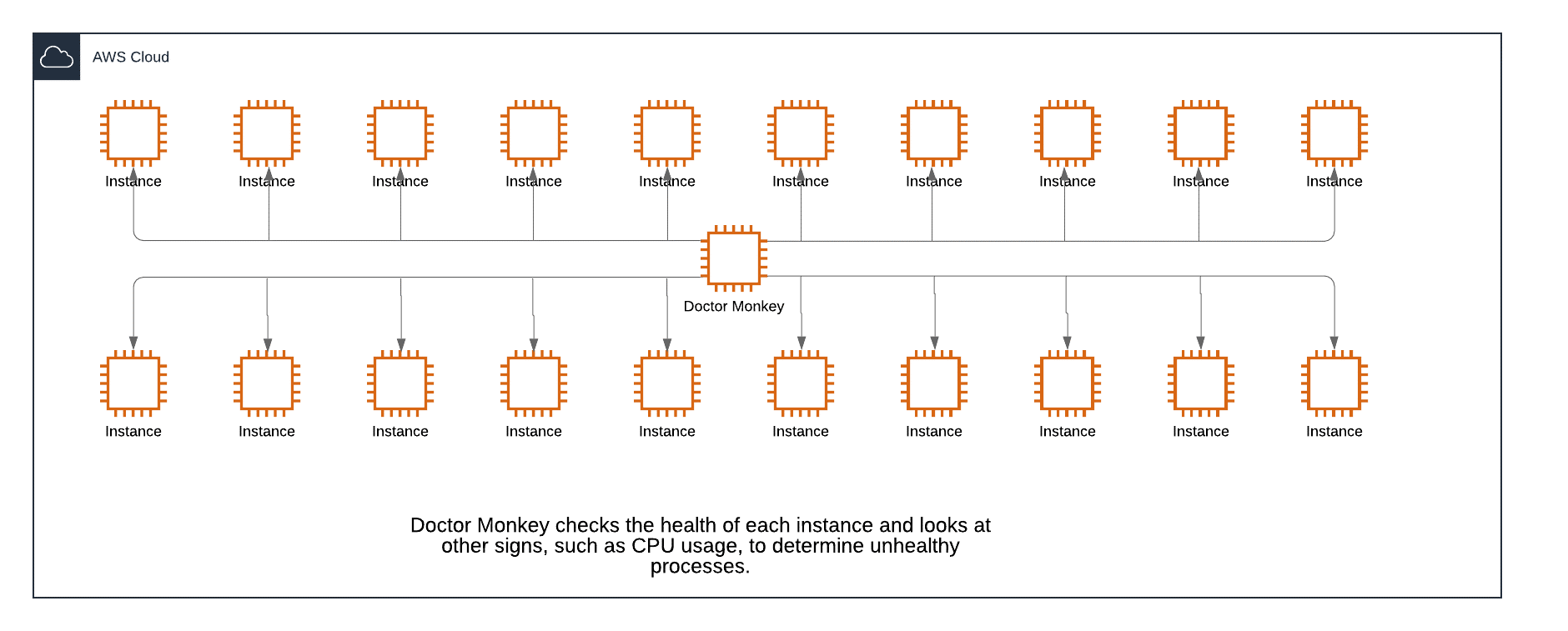 - Doctor Monkey checks the health of each instance and looks at other signs, such as CPU usage, to determine unhealthy processes.