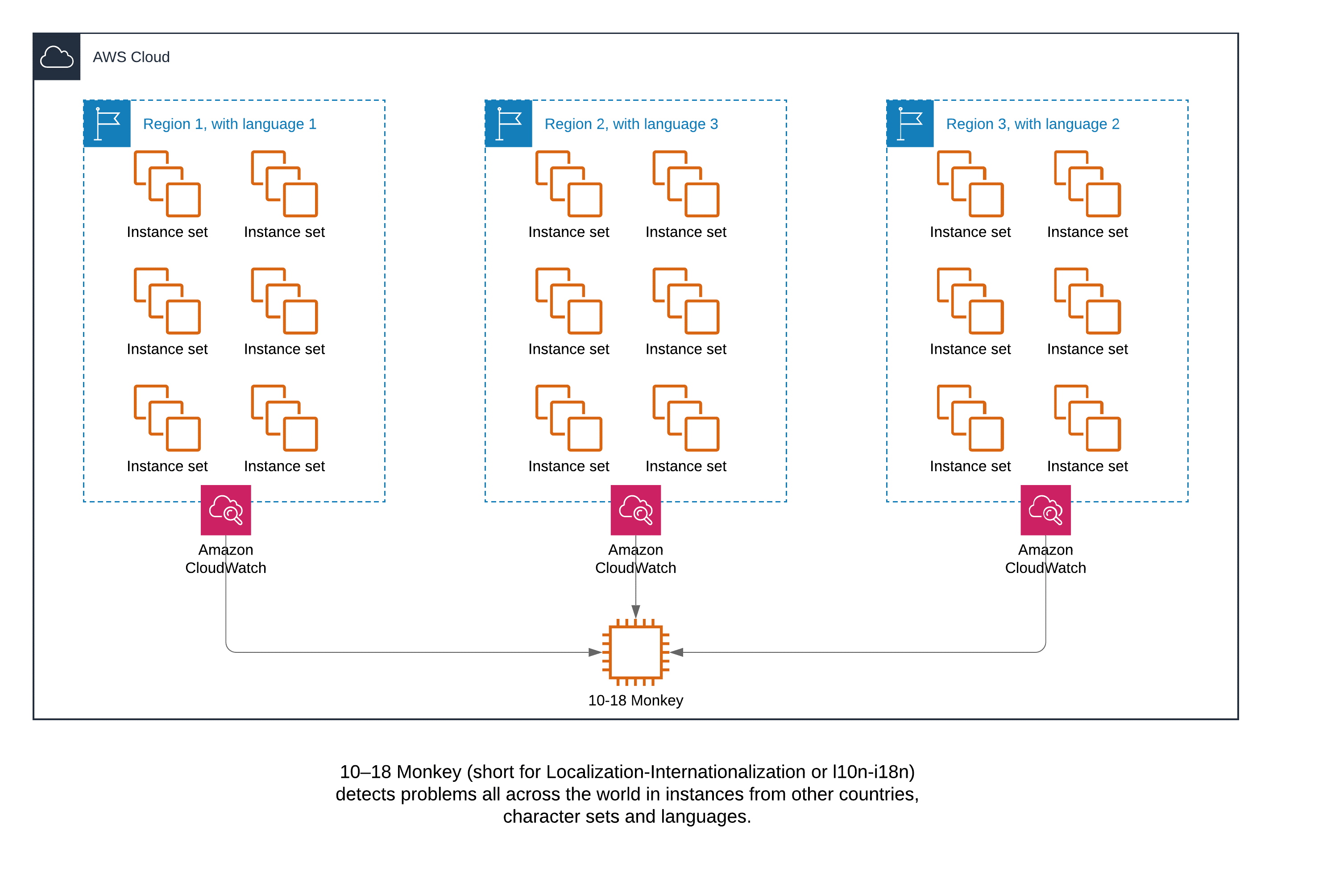 - 10 – 18 Monkey (short for Localization - Internationalization or i10n - i18n) detects problems all across the world in instances from other countries, character sets and languages.