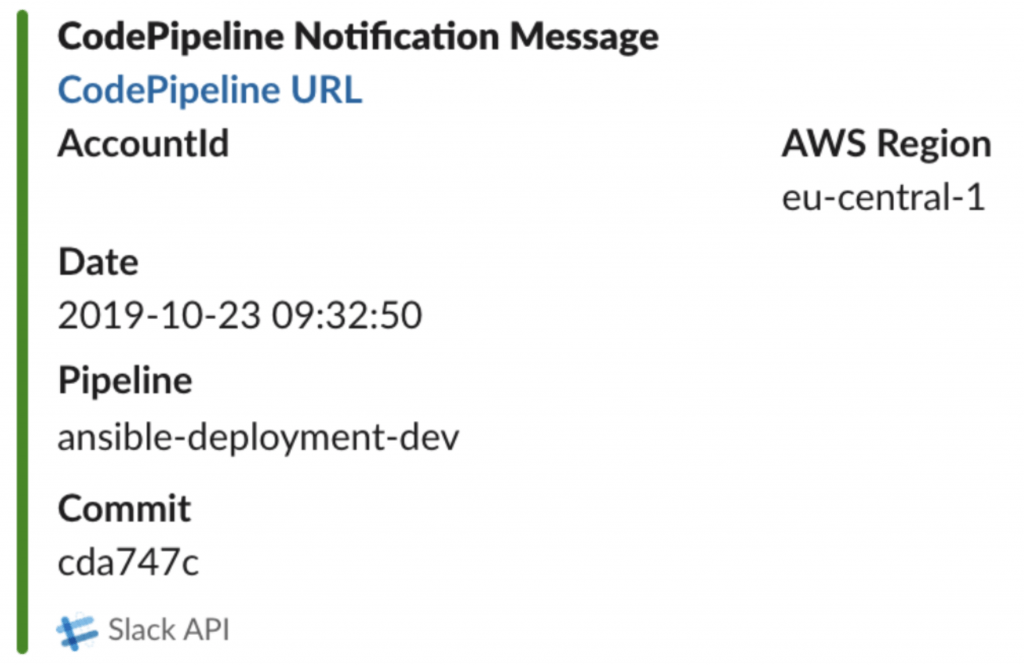 {"attachments": [{"color": "#298A08","author_name": "CodePipeline Notification Message","title": "CodePipeline URL","title_link": "to_replace","attachment_type": "default","fields": [{"title": "AccountId","value": "to_replace","short": true},{"title": "AWS Region","value": "to_replace","short": true},{"title": "Date","value": "to_replace","short": true},{"title": "Pipeline","value": "to_replace","short": false},{"title": "Commit","value": "to_replace","short": false}],"footer": "Slack API","footer_icon": "https://platform.slack-edge.com/img/default_application_icon.png"}]}