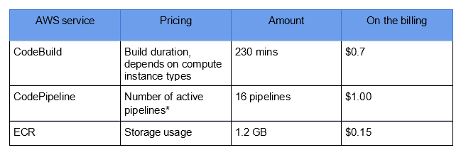 AWS native services are self-managed. AWS assumes responsibility for providing the most up-to-date and secure solutions. You pay only for what you use, and, actually, it works exactly like this. After 5 months we are paying ~$1.85 monthly for usage of main AWS services (CodeBuild, CodePipeline and ECR) in our pipelines, summarizing 2 AWS accounts with 5 regions.