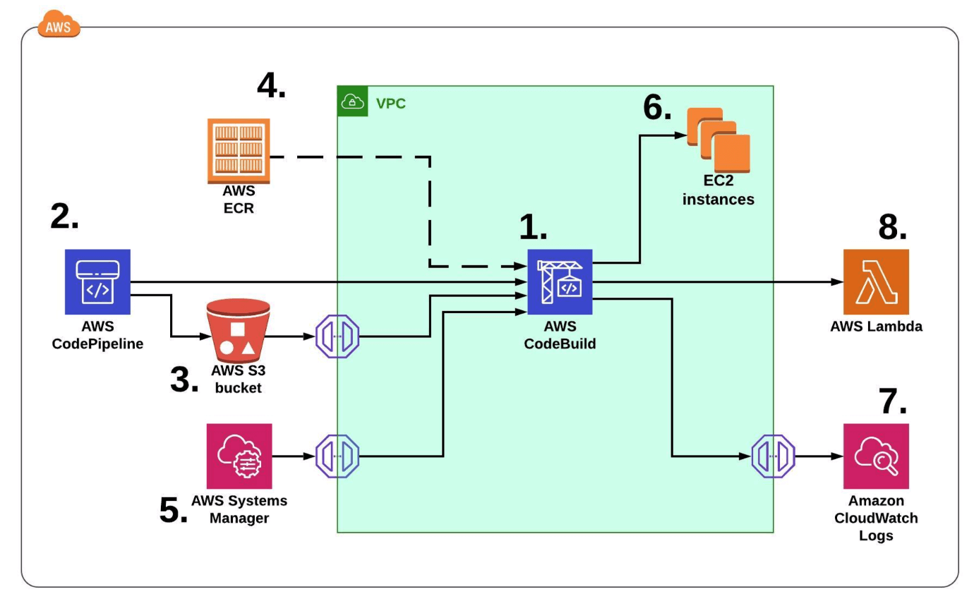 Diagram shown below describes the main AWS services required to build a pipeline: CodeBuild, CodePipeline, ECR, S3, Systems Manager, CloudWatch and Lambda.
