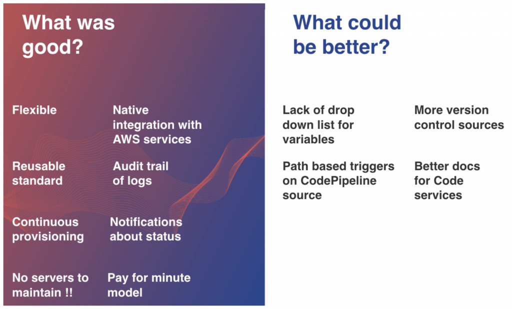 - Better docs for Development services — very few implementations, not many good examples of CodeBuild inside VPC, we spent most of the time figuring out this configuration.