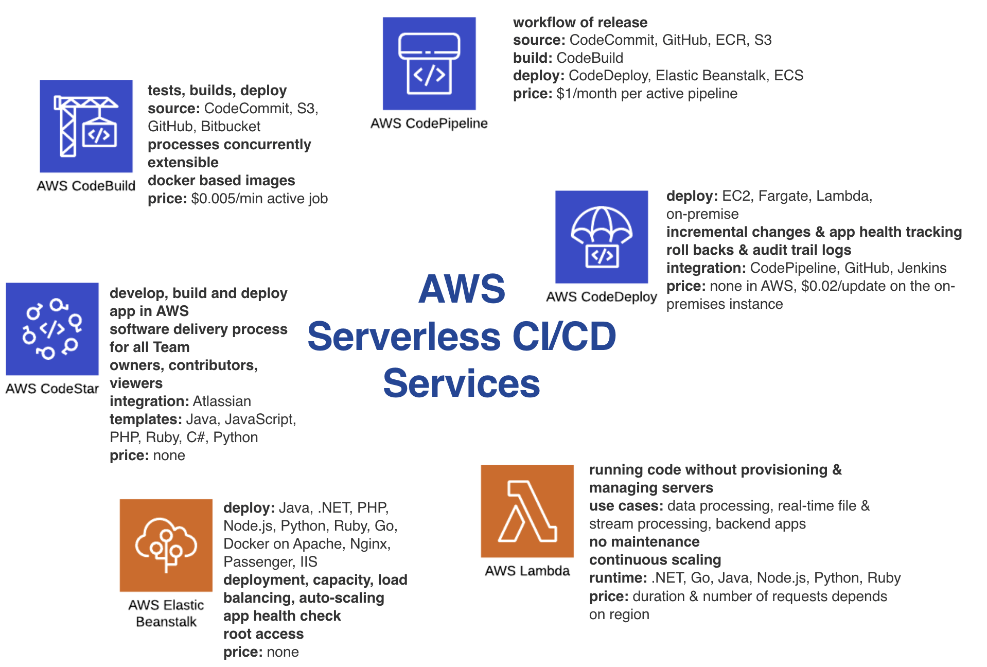 - Deploy: CodeDeploy, ECS, EC2, Elastic Beanstalk, CloudFormation, ServiceCatalog