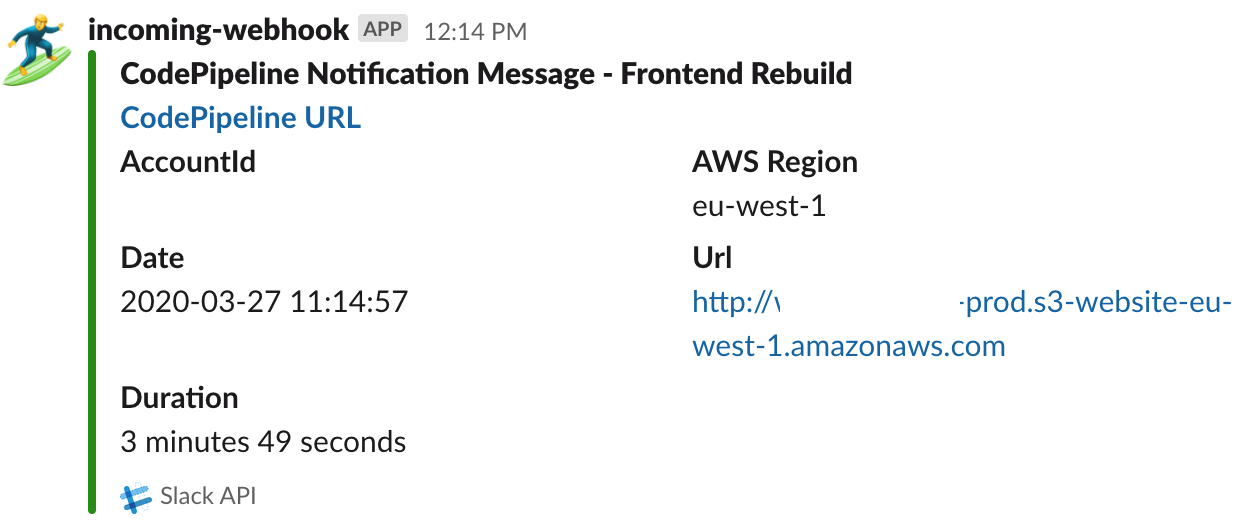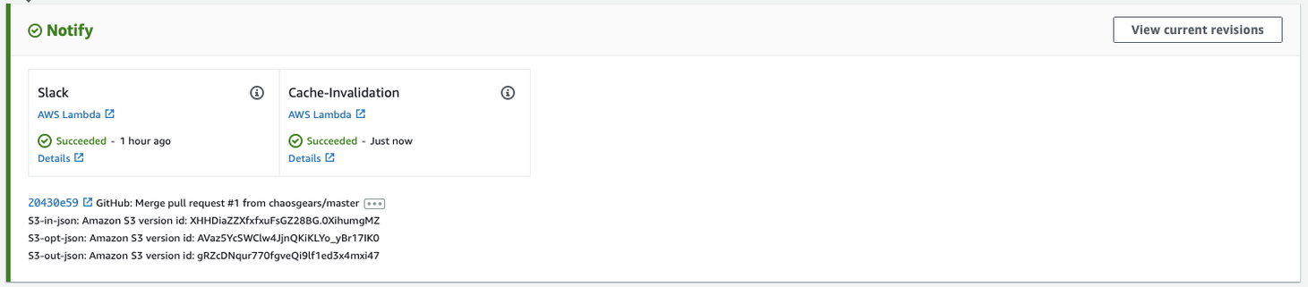 Whenever I design any piece of automated flow I constantly challenge myself, especially when working on notifications. I try to make them as helpful and understandable as possible so they won’t cause any doubts, like ‘Is it finished or did something go wrong?’ This time I used a well know Lambda function for Slack notifications that sends acknowledgements of success with a format presented below. It’s the same pattern with Lambda code that I’ve provided for failures caught in the pipeline. The second parallel Lambda function was added to address the problem of cache invalidation, which allows us to remove an object from the CloudFront cache before it expires.