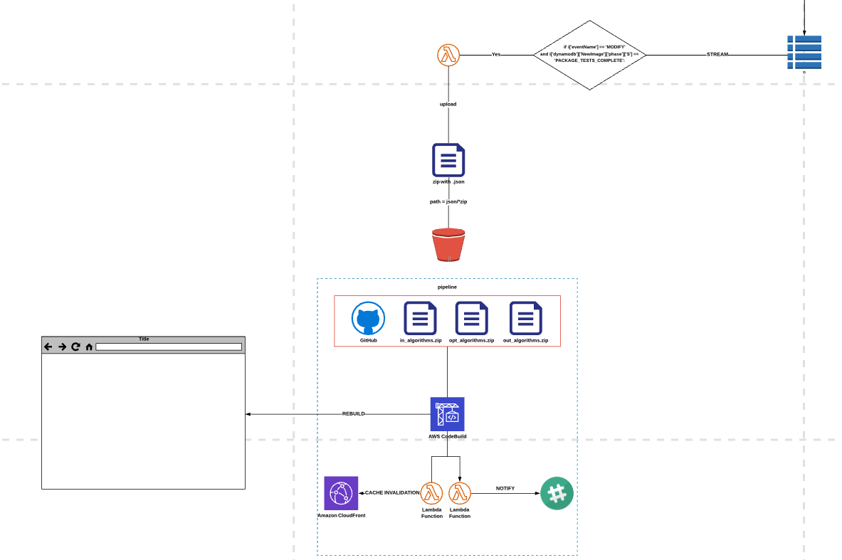 Below, you can see the outcome view in AWS console. The reason for using 3 different source s3 objects is a number of algorithm types. We’ve leveraged Lambda function to update particular s3 objects after receiving the data via DynamoDB Streams. A stream is invoked when phase attribute is changed into PACKAGE_TESTS_COMPLETE. For us, this means the test went through successfully and it’s time to make changes in the User Interface.