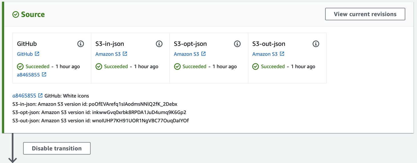 resource "aws_codepipeline" "pipeline" {name = "${var.app}-${var.service}-${var.info}-${var.stage}"role_arn = "${aws_iam_role.codepipeline_role.arn}"artifact_store {location = "${aws_s3_bucket.codepipeline.bucket}"type = "S3"}stage {name = "${var.stage_1_name}"action {name = "${var.stage_1_action_1}"category = "Source"owner = "ThirdParty"provider = "GitHub"version = "1"output_artifacts = ["${var.artifact1}"]configuration {Owner = "${var.repository_owner}"Repo = "${var.repository}"Branch = "${var.branch}"OAuthToken = "${data.aws_ssm_parameter.github_token.value}"}}action {name = "${var.stage_1_action_2}"category = "Source"owner = "AWS"provider = "S3"version = "1"output_artifacts = ["${var.artifact2}"]configuration {S3Bucket = "${var.source_bucketname}"S3ObjectKey = "${var.source_path_in}"}}action {name = "${var.stage_1_action_3}"category = "Source"owner = "AWS"provider = "S3"version = "1"output_artifacts = ["${var.artifact3}"]configuration {S3Bucket = "${var.source_bucketname}"S3ObjectKey = "${var.source_path_opt}"}}action {name = "${var.stage_1_action_4}"category = "Source"owner = "AWS"provider = "S3"version = "1"output_artifacts = ["${var.artifact4}"]configuration {S3Bucket = "${var.source_bucketname}"S3ObjectKey = "${var.source_path_out}"}}}