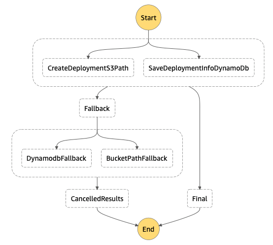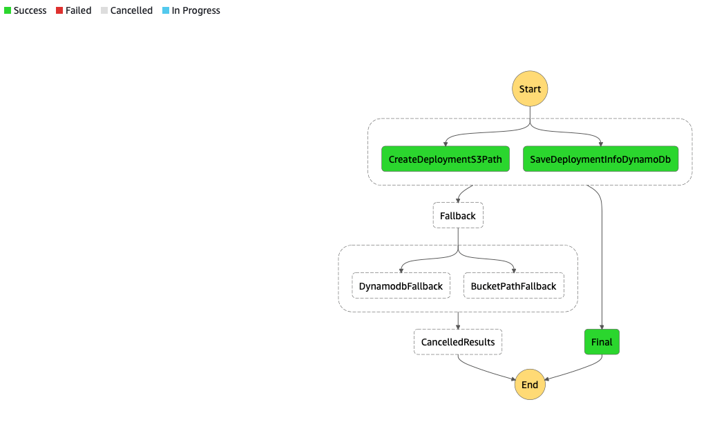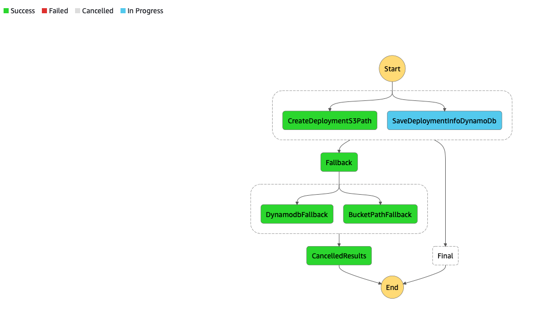 The diagram pasted at the beginning of my article covered the parallel scenario, containing a step with two Lambda Functions (DynamoDBFallback, BucketPathFallback) which generally are the compensating mirror reflections for CreateDeploymentS3Path and SaveDeploymentInfoDynamoDB. Forget about the names which have been changed for the sake of this article. I hope my dear readers have already got the point. Whenever you code a Lambda Function which is going to be used in a workflow to change the state, always think about keeping the consistency in case of failure. I don’t have to remind that keeping the idempotence in such scenario is obviously a must-have.